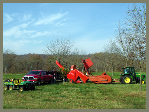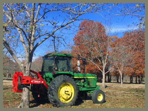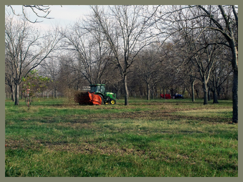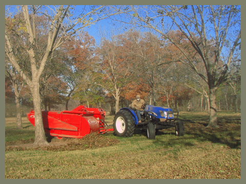 After 'shaking' the pecans from the trees, the next operation is to 'harvest' the pecans from the orchard floor. This process begins at the outer limits of the tree's canopy and works inward to the trunk of the tree. A leaf blower has already blown the pecans from the ground immediately surrounding the trunk so as to make them accessible to the harvester.